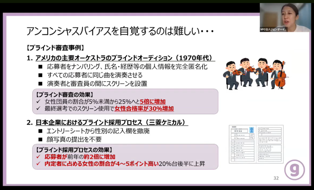 今回のセミナーは参加者が多様であったため、初めてジェンダーについて知る方がいることも想定して丁寧に言葉の意味を説明しました。アンコンシャスバイアスとは誰しもが持っているものであり、持っていることが良い・悪いではなく、重要な意思決定を行う際に自身のバイアスを意識的に排除できるようにすることが重要であることを伝えました。さらに日本語はハイコンテクストであるという特性によって、アンコンシャスバイアスが生じやすいため、意図的に言語化することも重要であることも補足としてお伝えしました。